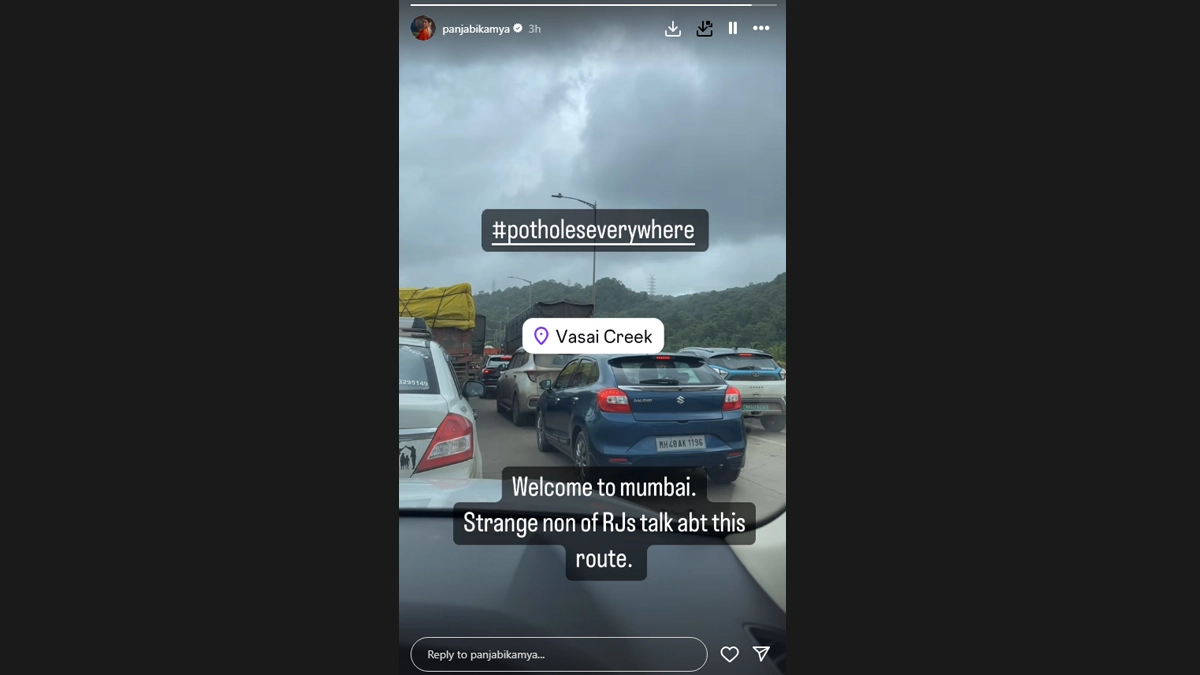 Actress Kamya Panjabi on Tuesday voiced her frustration about the condition of the roads in Mumbai’s Vasai Creek area, highlighting the issue of potholes that have been largely overlooked. Kamya, who has 1.2 million followers on Instagram, shared a video on her Stories section showing the heavy downpour and the traffic congestion caused by the potholes in the area. The actress noted that despite the severity of the situation, none of the radio jockeys (RJs) seem to discuss this route. Kamya captioned the video: "#potholeseverywhere... Welcome to Mumbai. Strange none of the RJs talk about this route." The video was tagged with the location of Vasai Creek. Kamya Punjabi Is Not Open to Any Dance Reality Shows- Here’s Why.