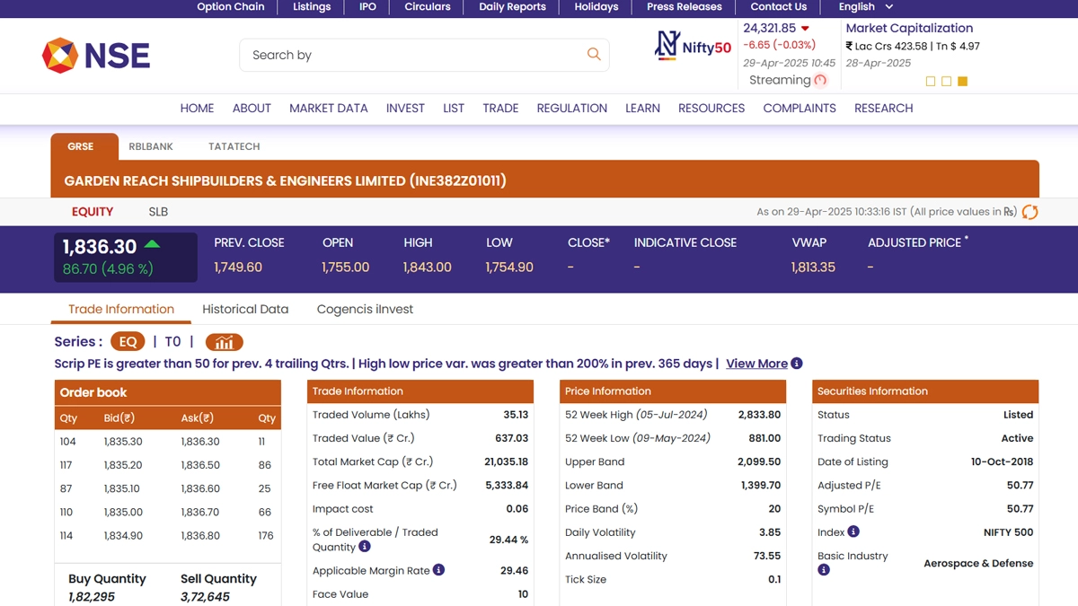 Shares of Garden Reach Shipbuilders & Engineers Ltd (NSE: GRSE) surged nearly 5% today, April 29, trading at INR 1,836.30, up from the previous close of INR 1,749.60. The rally comes amid heightened tensions along the India-Pakistan border following a terror attack in Pahalgam, prompting investor interest in defence stocks. GRSE also signed a long-term lease agreement with the Syama Prasad Mookerjee Port in Howrah, boosting its operational capacity. Market sentiment turned bullish on expectations of increased government defence spending. The stock, though far from its 52-week high of INR 2,833.80, is gaining traction. RBL Bank Share Price Today, April 29: RBL Bank Shares Dip Despite Positive Earnings Outlook, Check Latest Price on NSE.