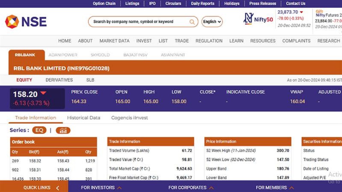 The shares of RBL Bank Limited (NSE: RBL Bank) opened in negative today, December 20. According to the latest trading updates on the National Stock Exchange (NSE), RBL Bank Limited (NSE: RBL Bank) stock was trading at INR 158.20 and saw a decline of INR 6.13 from the previous day's closing of INR 164.33. The RBL Bank Limited (NSE: RBL Bank) stock saw its 52-week high price on January 11, with the share trading at INR 300.70. Exide Share Price Today, December 20: Check Exide Industries Limited Stock Prices on NSE and BSE.