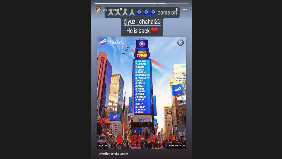 Social media sensation and dancer Dhanashree Verma has reacted to her cricketer husband Yuzvendra Chahal's inclusion in the Indian squad for the upcoming T20 World Cup. On Tuesday, Dhanashree took to the Stories section of her Instagram and shared the picture of a billboard which lists the members of Team Indiaās T20 squad. She wrote on the picture, "come on. @yuzi_chahal23 He is back". The Board of Control for Cricket in India (BCCI) on Tuesday announced India's 15-member squad for the upcoming ICC Men's T20 World Cup. MI vs RR Stat Highlights: Trent Boult, Yuzvendra Chahal Register New Records As Rajasthan Royals Trump Mumbai Indians By Six-Wickets.