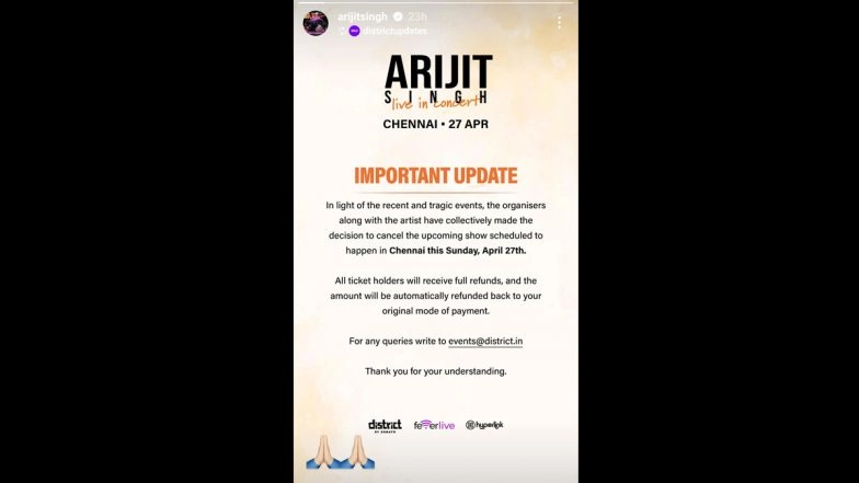 In a post shared on his Instagram Stories, Arijit re-shared a note from the event organisers, stating that the show has been cancelled out of respect for the victims and their families. The note read, "IMPORTANT UPDATE. In light of the recent and tragic events, the organisers, along with the artist, have collectively made the decision to cancel the upcoming show scheduled to happen in Chennai this Sunday, April 27th."