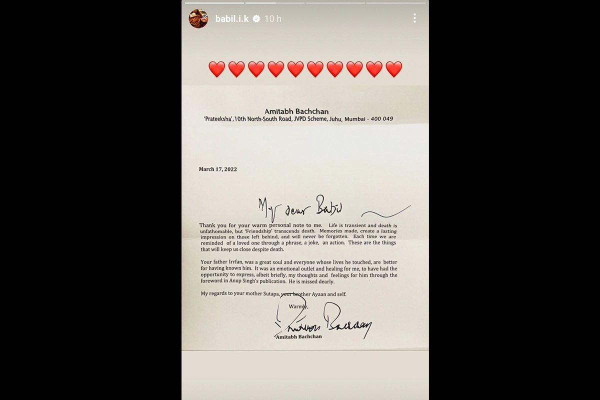Megastar Amitabh Bachchan recently sent a heartfelt note to late legendary actor Irrfan Khan's son Babil. It's been a year since iconic actor Irrfan Khan left for his heavenly abode, but he is fondly remembered by his friends, fans and family members. His elder son Babil, who was away from home for shooting a project, returned to a special note sent to him by Amitabh Bachchan. Irrfan Khan’s Son Babil Khan Shares Unforgettable Holi Moments Spent With His Parents in These Throwback Pictures!