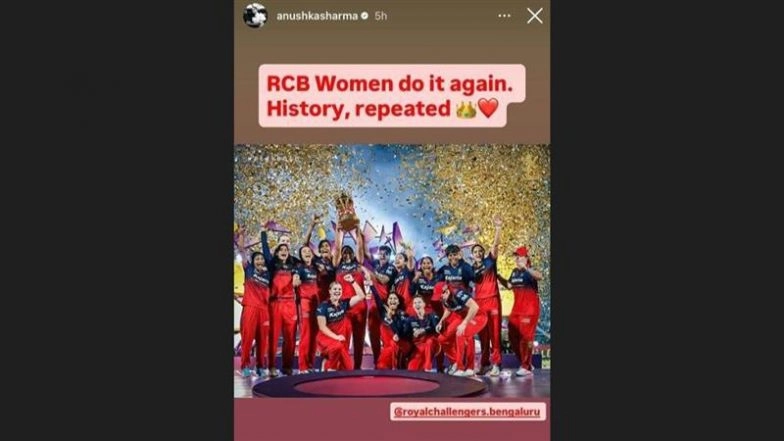 Bollywood actor Anushka Sharma joined the celebrations after Royal Challengers Bengaluru clinched their second Women's Premier League title with a six-wicket win over Delhi Capitals, hailing the historic achievement as a repeat triumph for the franchise. RCB-W Win WPL 2026, Delhi Capitals Women Suffer 4th Consecutive Defeat in Finals.