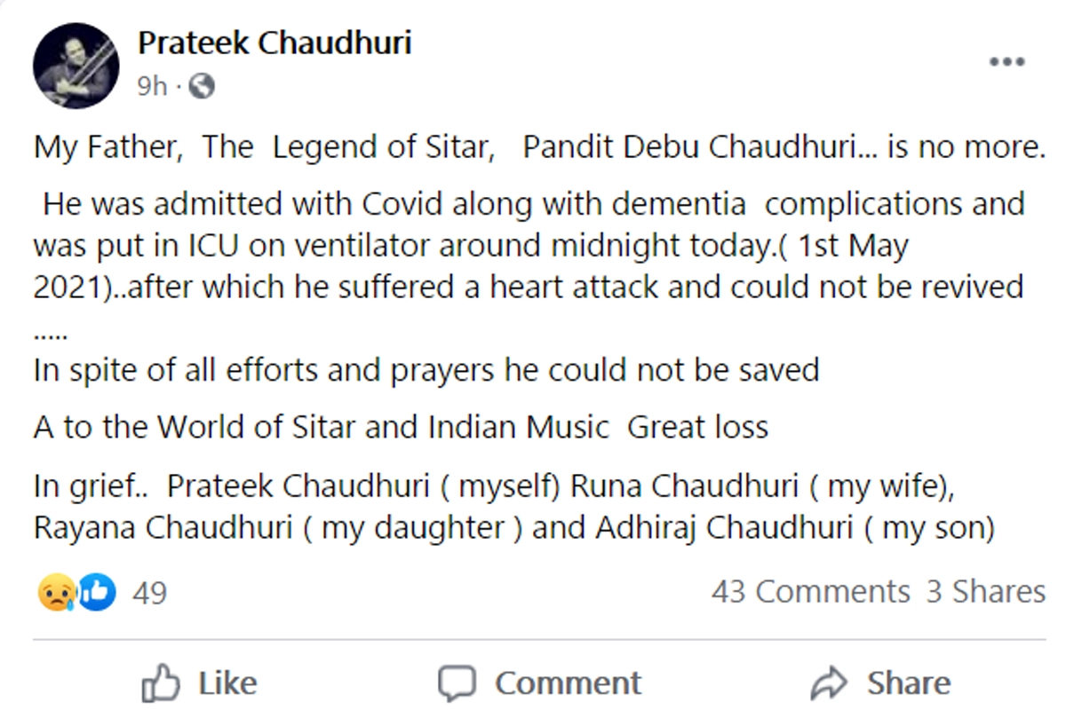 Sitar maestro Pandit Devbrata Chaudhuri died of Covid related complications at a Delhi hospital on Saturday, his son Prateek Chaudhuri said. He was 85.Prateek announced the death of his father, more popularly known as Debu Chaudhuri, on his official Facebook page. "My Father, The Legend of Sitar, Pandit Debu Chaudhuri... is no more. Bikramjeet Kanwarpal Dies Due to COVID-19; Actor Was Known for His Roles in Page 3 and Prem Ratan Dhan Payo (View Post).