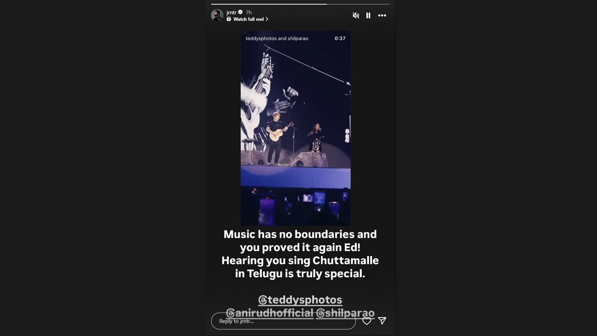 Taking to his Instagram handle, Jr NTR shared a short video of Ed Sheeran's performance from Bengaluru concert on Sunday and wrote, "Music has no boundaries and you proved it again Ed! Hearing you sing Chuttamalle in Telugu is truly special."