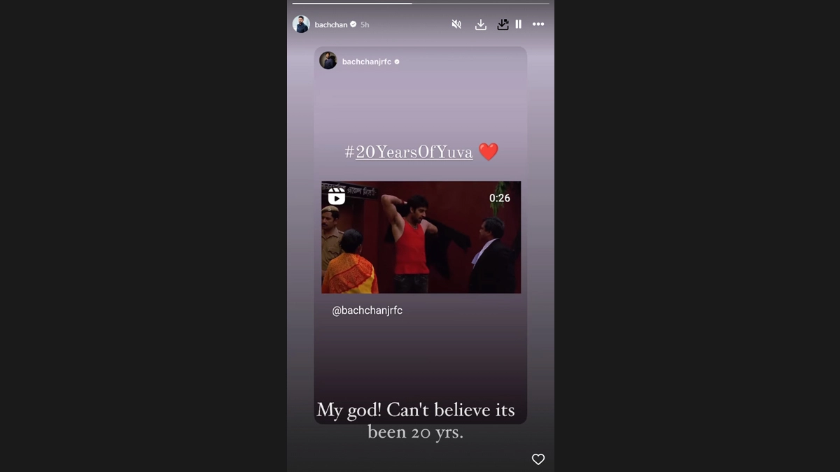 How time flies! Mani Ratnam's 2004 film Yuva, released on May 21, completed 20 years this week. Interestingly, the film came out during the General Elections. And now it marked its 20th anniversary at a time when India is busy hosting the 18th Lok Sabha Elections. With Yuva, Ratnam underlined the importance of the direct participation of the Youth in elections. Actors Abhishek Bachchan, Rani Mukerji, Vivek Oberoi, Ajay Devgn and Kareena Kapoor Khan played pivotal roles in the fictionalized political drama. As the film was completed two decades recently, Abhishek, who essayed the character of Lallan Singh, took to Instagram and re-shared one of the posts of his fans about Yuva. "My God! Can't believe it's been 20 years," he wrote. Reportedly, Hrithik was first offered Abhishek's role in the film. Meanwhile, Abhishek will be heading Shoojit Sircar's film in the coming months. It will be released on November 15. Abhishek Bachchan Gives a Glimpse of His Upcoming Untitled Film With Shoojit Sircar, Calls It ‘Special’ (Watch Video).