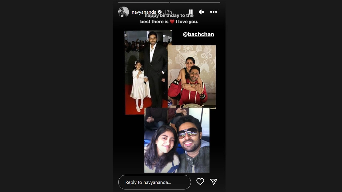 On the occasion of his 47th birthday, Abhishek Bachchan received a lovely wish from his niece Navya Nanda. Navya took to Instagram Stories and shared a collage featuring happy moments of hers with 'mamu' Abhishek. In the collage, we can see little Navya posing for the camera while holding her mamu's hands. The collage also shows Navya giving a tight hug to Abhishek from behind. "Happy birthday to the best there is (red heart emoji)...I love you," she captioned the post. Abhishek Bachchan Birthday Special: From Bholaa, SSS7 to Ghoomer, Every Upcoming Film of the Bollywood Actor.