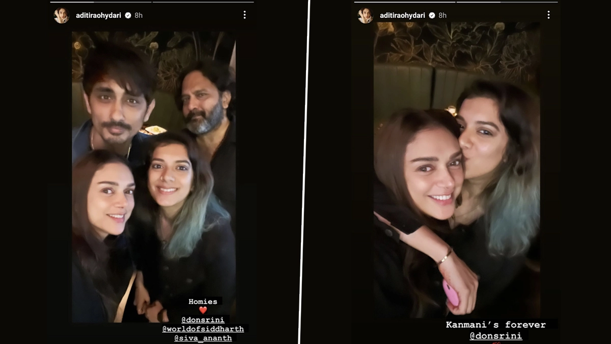 Actor Aditi Rao Hydari on Monday shared a selfie with her rumoured boyfriend and Aditi took to Instagram and treated fans to a glimpse of date night with her homies. In the picture, Aditi can be seen posing with Siddharth and other friends. Sharing the photo, she wrote, “Homies.” Aditi and Siddharth have remained tight-lipped about their relationship. If reports are to be believed, the two fell in love with each other on the sets of their film Maha Samundram in 2021. Few months ago, on Siddharth’s birthday, Aditi shared an adorable video from their vacation to wish her "manicorn". Aditi Rao Hydari Clicked With Rumoured Boyfriend Siddharth at Mumbai Airport, Duo Jet Off to an Undisclosed Location (Watch Video).