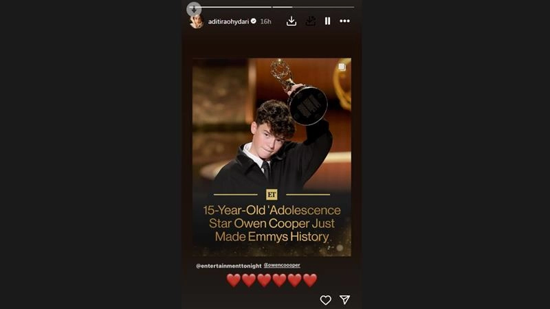 Aditi Rao Hydari, who is known for her role in Sanjay Leela Bhansali's Heeramandi, expressed her love for the actor's achievements as she reshared an Instagram post of the Entertainment Tonight outlet featuring the news of Owen Cooper's win.
