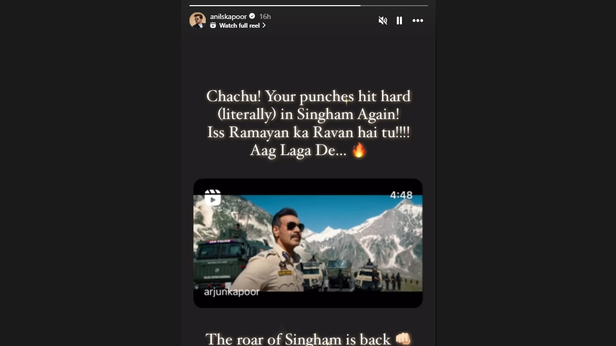 Anil re-shared the trailer video and gave a shout out to his Arjun. He wrote, "Chachu! Your punches hit hard (literally) in Singham Again! Iss Ramayan ka Ravan hai tu!!!! Aag Laga De..The roar of Singham is back."