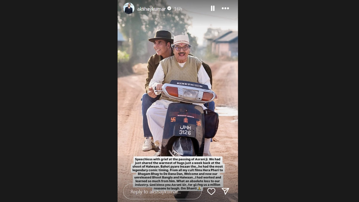 Actor Akshay Kumar, known for working with Asrani in several hit films, led the lines of tributes with an emotional message. Remembering their films, Akshay described his passing as an "absolute loss" to the film industry. He also confirmed working with the late actor in Priyadarshan's upcoming films, Bhoot Bangla and Haiwaan.
