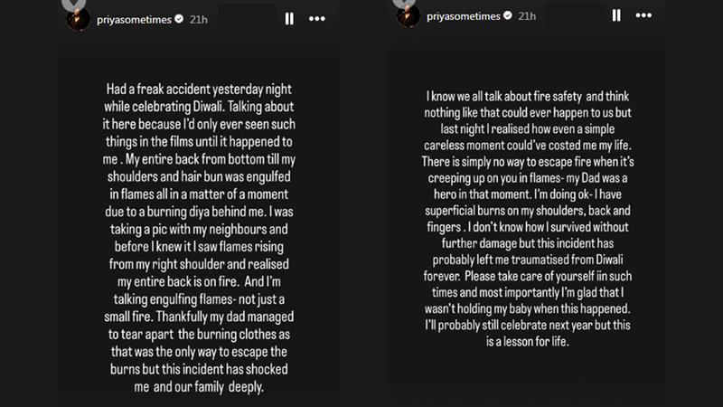 "I know we all talk about fire safety and think nothing like that could ever happen to us, but last night I realised how even a simple, careless moment could've cost me my life. There is simply no way to escape fire when it's creeping up on you in flames. My Dad was a hero in that moment. I'm doing okay. I have superficial burns on my shoulders, back, and fingers," Priya wrote. Diwali 2025: Urvashi Rautela Says, ‘Diwali Shines Brightest When You’re With Those Who Matter’.