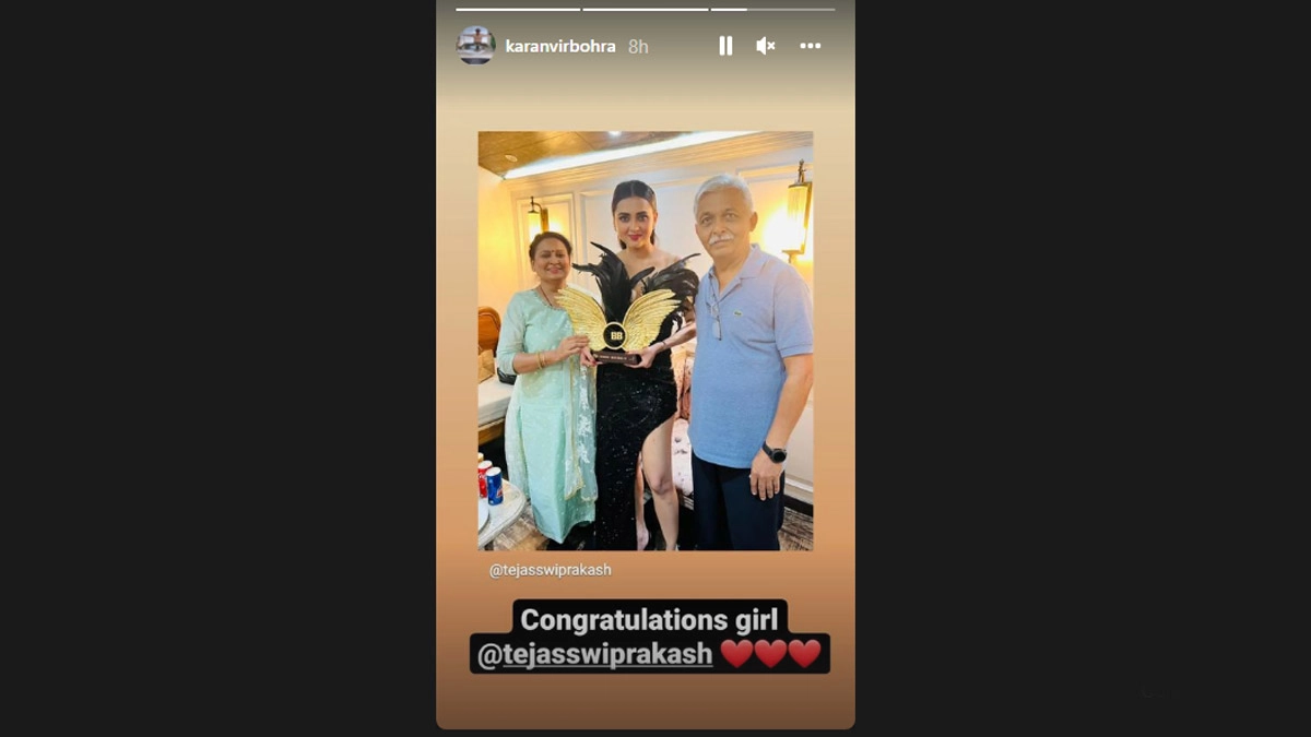 Karanvir Bohra shared a picture on his Instagram Story of Tejasswi posing with her parents after the big win. He added, "Congratulations girl @tejasswiprakash."