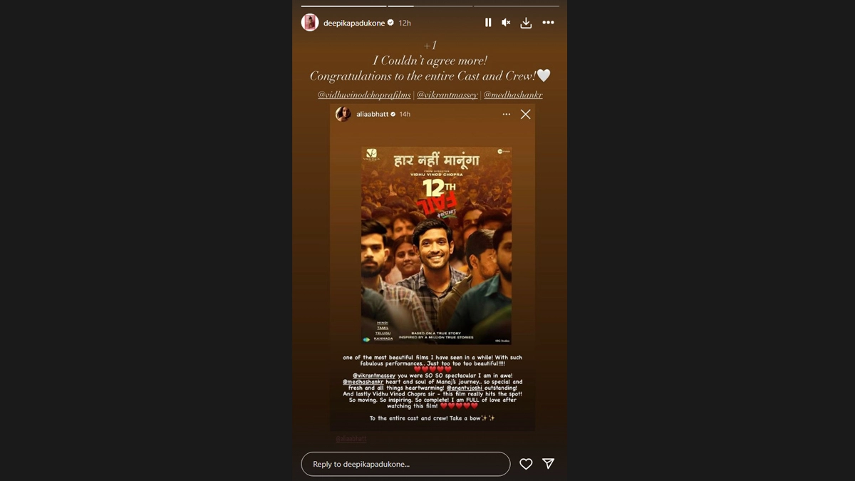 Filmmaker Vidhu Vinod Chopra's recent release 12th Fail is garnering a lot of praise from fans and Bollywood stars as well. On Tuesday night, actor Deepika Padukone took to her Instagram stories to heap praise on the team. She reposted actor Alia Bhatt's review of the film and wrote, "I couldn't agree more! Congratulations to the entire cast and crew." Recently, Alia had lauded Vikrant Massey's performance in the biographical drama. She took to her Instagram story to share the poster of 12th Fail along with a note. "One of the most beautiful films I have seen in a while! With such fabulous performances.. Just too too too beautiful!!!!@vikrantmassey you were SO SO spectacular I am in awe!@medhashankr heart and soul of Manoj's journey.. so special and fresh and all things heartwarming! Canantvjoshi outstanding!And lastly Vidhu Vinod Chopra sir - this film really hits the spot! So moving. So inspiring. So complete! I am FULL of love after watching this film! To the entire cast and crew! Take a bow," she posted. 12th Fail Movie: Review, Cast, Plot, Trailer, Release Date – All You Need to Know About Vikrant Massey’s Film!.