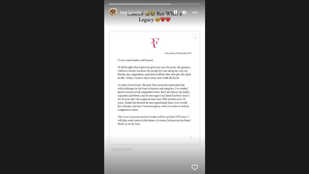 I was given a special talent to play tennis, and I did it at a level that I never imagined, for much longer than I ever thought possible," Federer said in the note "I would like to especially thank my amazing wife Mirka who has lived through every minute with me. She has warmed me up before finals, watched countless matches even while over 8 months pregnant. And has endured my goofy side on the road with my team for over 20 years. I also want to thank my 4 wonderful children for supporting me, always eager to explore new places and creating wonderful memories along the way," he concluded.