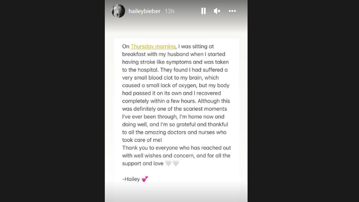 "On Thursday morning, I was sitting at breakfast with my husband when I started having stroke-like symptoms and was taken to the hospital," Hailey, who is married to singer-songwriter Justin Bieber, wrote on her Instagram Story. "They found I had suffered a very small blood clot to my brain, which caused a small lack of oxygen, but my body had passed it on its own and I recovered completely within a few hours," she said.