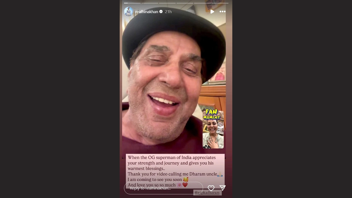 TV actress Hina Khan recently had a special "fan moment" when veteran actor Dharmendra video-called her to share his blessings. Hina, who is battling stage three breast cancer, was deeply moved by the kind gesture from the legendary actor. Hina took to her Instagram account to share a screengrab from the video call in which Dharmendra can be seen wearing a maroon T-shirt and black cap, while Hina appears in a grey top. ‘My Chemos Are Over’: Hina Khan Shares Major Health Update Amid Breast Cancer Diagnosis As She Attends Event in Mumbai (Watch Video).