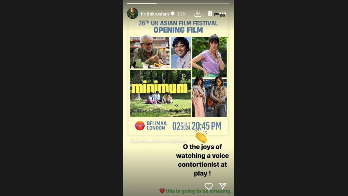 Hrithik Roshan, who never fails to shower love upon his girlfriend Saba Azad, recently celebrated her film Minimum securing an opening at the UK Asian Film Festival in London. Taking to Instagram on Thursday, the actor shared his pride for the movie's screening. Expressing his excitement, the actor wrote, "Oh, the joys of watching a voice contortionist at play. This is going to be amazing." The movie, directed by debutant Rumana Molla, stars Namit Das, Geetanjali Kulkarni, Rumana, Naseeruddin Shah, and Saba in key roles. Hrithik Roshan in Krrish 4! Siddharth Anand Confirms Actor’s Return As the Superhero in the Upcoming Film (View Post).