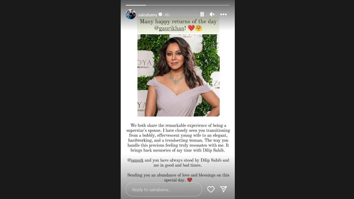 She wrote, "Many happy returns of the day Gaurikhan! We both share the remarkable experience of being a superstar's spouse. I have closely seen you transitioning from a bubbly, effervescent young wife to an elegant, hardworking, and a trendsetting woman. The way you handle this precious feeling truly resonates with me." She also shared how Shah Rukh and Gauri have stood by Dilip Sahib and her in good and bad times. "It brings back memories of my time with Dilip Sahib. @iamsrk and you have always stood by Dilip Sahib and me in good and bad times. Sending you an abundance of love and blessings on this special day," Banu added. Shah Rukh Khan Credits Gauri Khan For Suhana Khan's Upbringing, Says 'But Dimple is Mine'.