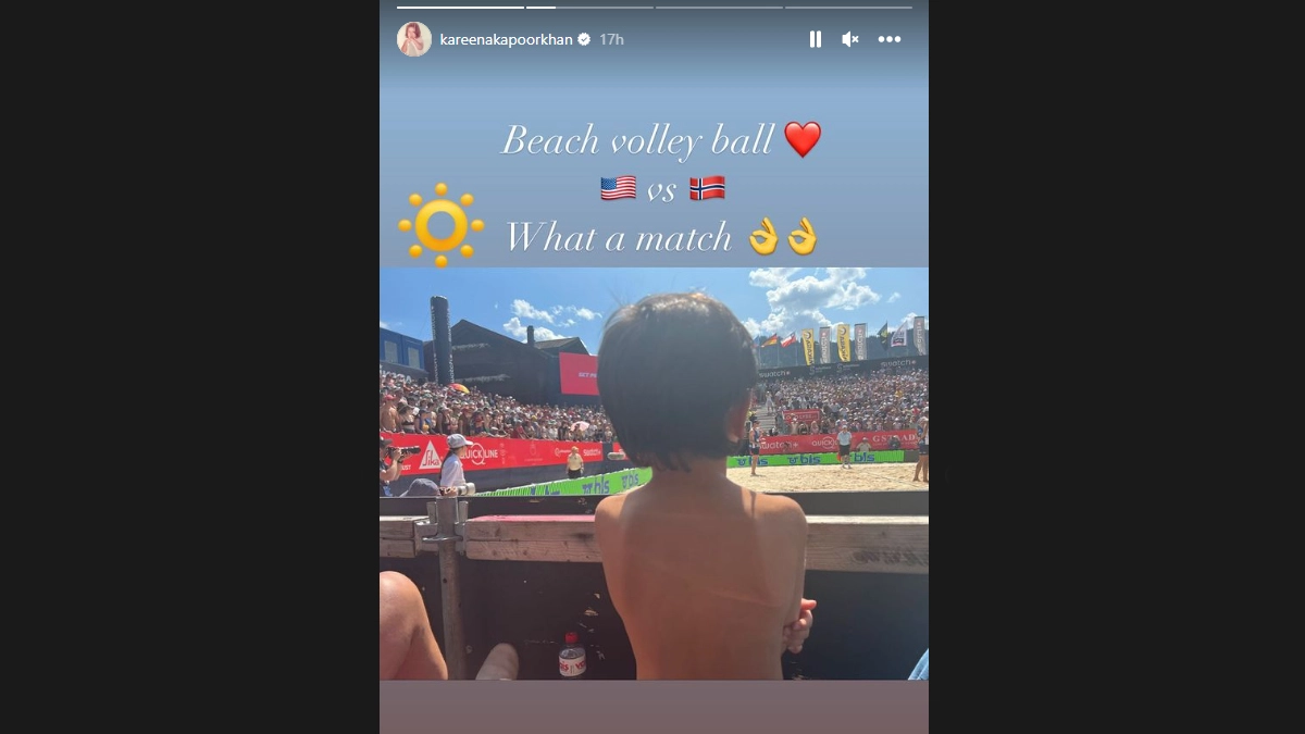 Actor Kareena Kapoor Khan is enjoying every bit of her vacation in Italy. Not leaving any place or activity to explore. The actor shared a glimpse of her Sunday date with her son Taimur watching beach volleyball. Taking to Instagram stories, Kareena dropped pictures featuring Taimur and a view of Italy. In the frame, Taimur can be seen shirtless and facing his back towards the camera while he is busy focusing on the volleyball match in a stadium. Sharing the photo, Kareena wrote, "Beach volleyball." She also added that the match was between US and added, "What a match."Siblings Ibrahim Ali Khan and Taimur Flaunt Their Abs in New Picture Shared by Kareena Kapoor Khan on Insta (View Post).