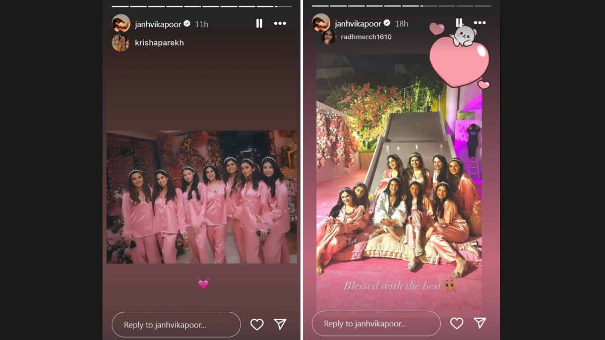 Ahead of the soon-to-be wedding of Anant Ambani and Radhika Merchant, Janhvi Kapoor and BFFs of the bride-to-be organized a bridal shower for her. Janhvi on Sunday shared some unseen moments from the bridal shower on her Instagram stories. The first picture shows eight girls wearing pink gathered around the bride-to-be, who looked lovely in her white satin nightwear with feather details. Kapoor reposted Radhika's post, which expressed gratitude for her friends with the caption that read, "Blessed with the best."' Earlier Janhvi also attended the grand pre-wedding celebrations of Anant Ambani and Radhika Merchant. Janhvi Kapoor Wears Necklace With Beau's Nickname 'Shikhu' Written on It at Maidaan Screening (See Pic).