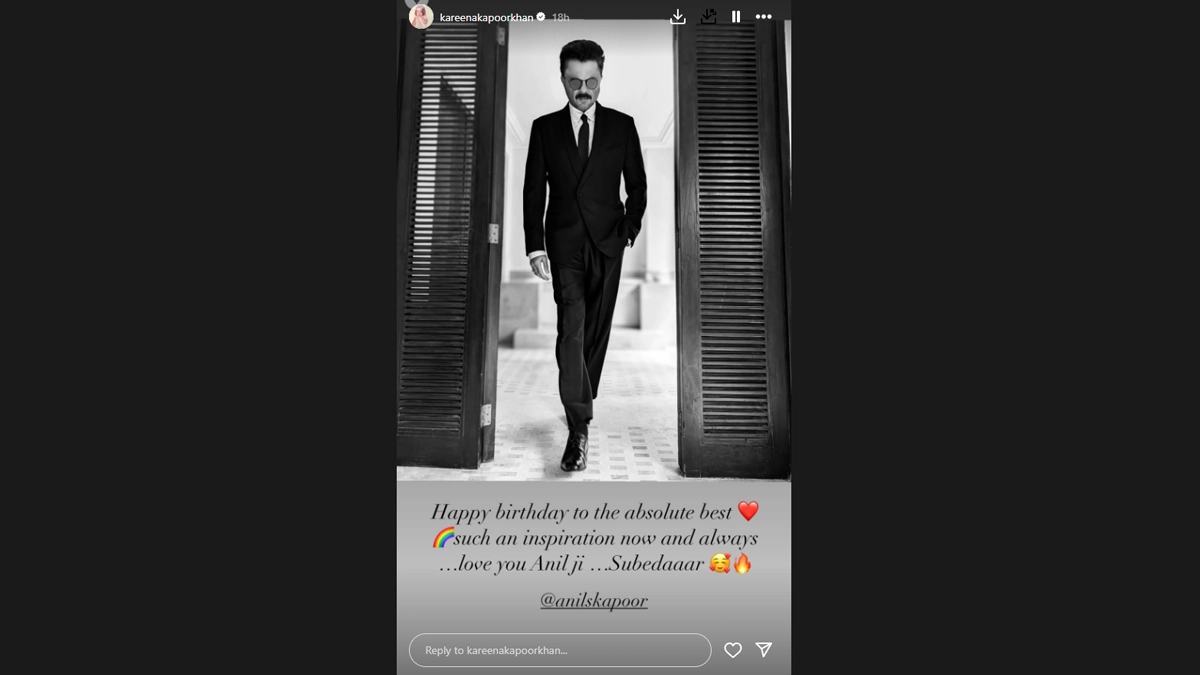 Kareena Kapoor Khan also extended her birthday wishes for the actor. Sharing a monochrome photo on her Instagram stories, the actress wrote, "Happy birthday to the absolute best. Such an inspiration now and always love you Anil Ji..Subedaar"