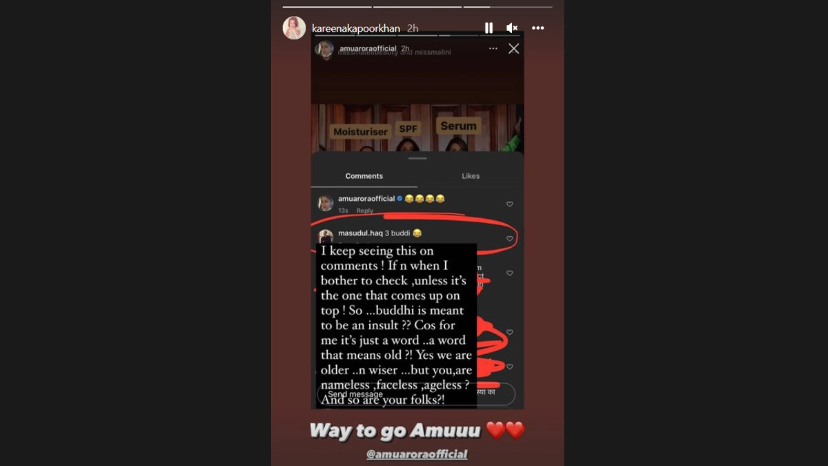 Taking to Amrita's Instagram stories, she shared a snapshot of a few comments on her post and wrote, "I keep seeing this on comments. If and when I bother to check unless it's the one that comes up on top! So...buddhi is meant to be an insult?? Cos for me it's just a word... a word that means old? Yes we are older and wiser but you are nameless, faceless, ageless? And so are your folks?"
