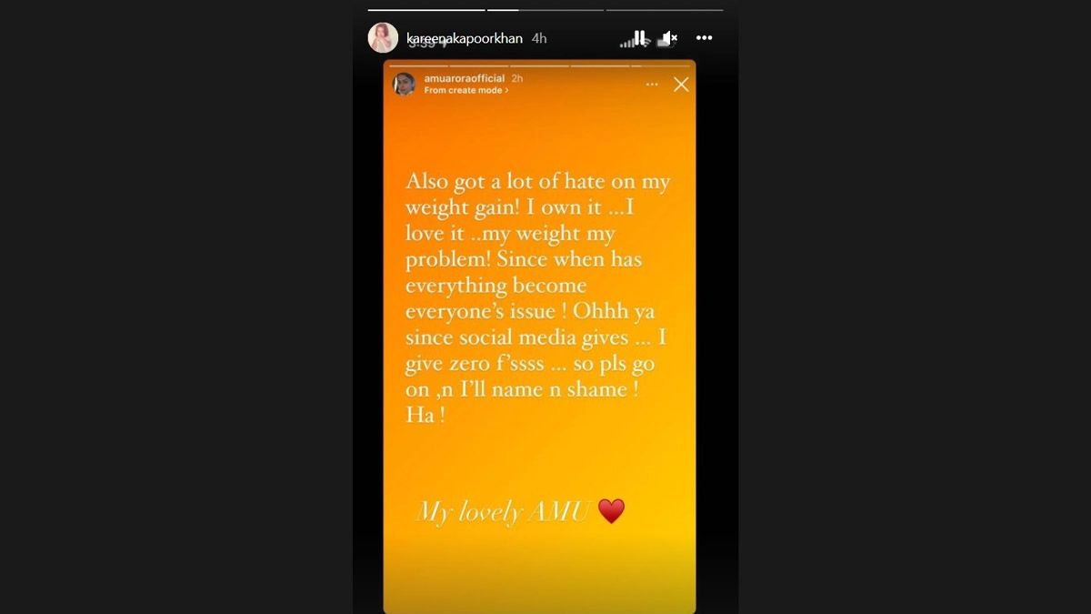 In her next story she wrote, "Also got a lot of hate on my weight gain! I own it... I love it ..my weight my problem! Since when has everything become everyone's issue! Ohhh ya since social media gives ... I give zero f'ssss ... so pls go on, and I'll name and shame! Ha!" Kareena Kapoor Khan Shares Pics With Hubby Saif Ali Khan from Karan Johar's Birthday Bash, Thanks KJo for Hosting a ‘Spectacular’ Party.