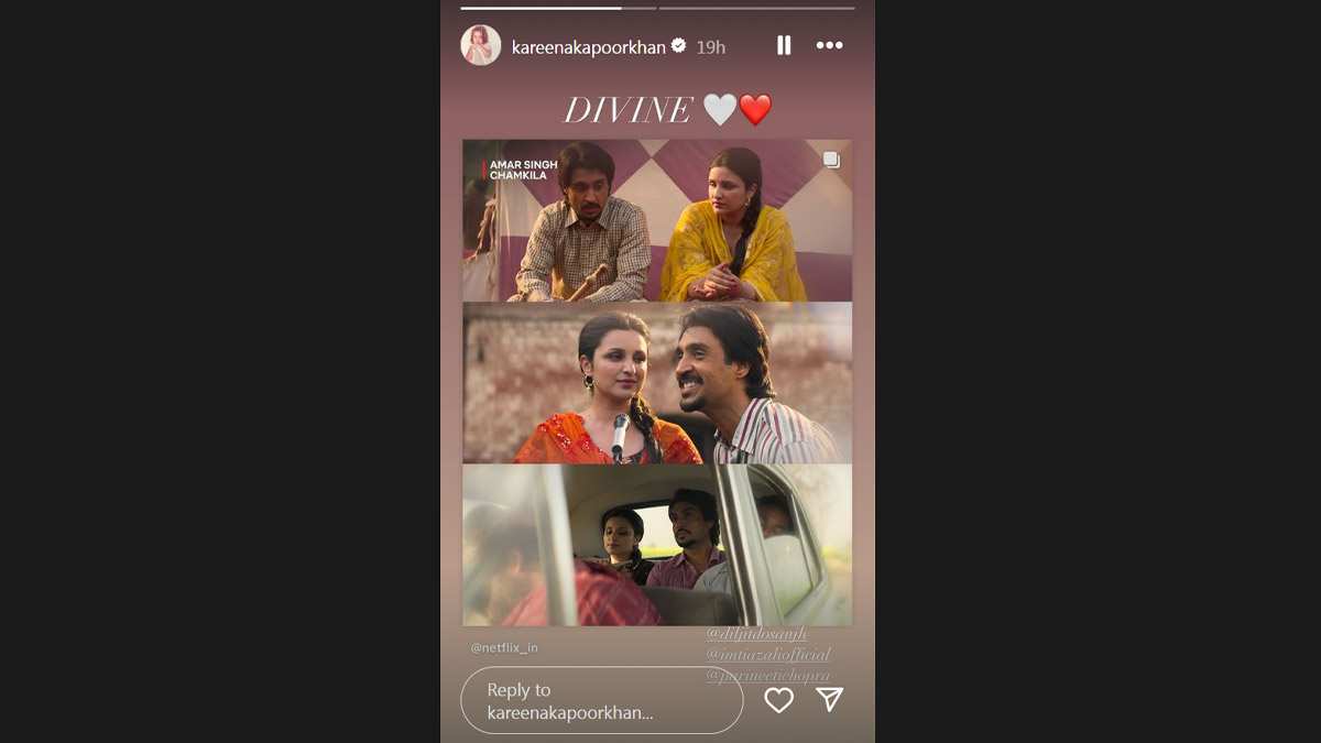 Kareena Kapoor Khan gave her Crew co-star Diljit Dosanjh a shout-out for his performance in Amar Singh Chamkila and called it 'Divine'. Sharing the collage of Diljit and Parineeti's scenes from the film on her Instagram stories, Kareena wrote, 'Divine'. Kareena, her brother-in-law, and actor Kunal Kemmu lauded Amar Singh Chamkila's team. Sharing the poster on his Instagram stories, Kunal penned a long message, "Uff!!! What a film. @imtiazaliofficial, thank you for making this one the way you did. It lingers within long after you have watched it." He continued, "@parineetichopra I'm so proud of you my friend. Kya kaam kiya hai. Thank you for making this incredible film @netflix_in. @diljitdosanjh paaji don't even know what to say about you. You are a supernova, and you shine as brightly as Chamkila. What a performance, and that voice is just something else." Kunal ended the note by saying, "The entire team of chamkila. Take a bow. You guys should be so proud of this one." Amar Singh Chamkila Review: Critics Applaud Diljit Dosanjh’s Performance As the Legendary Punjabi Musician, Label Imtiaz Ali Directorial As the ‘Best Music Biopic Made in India’.
