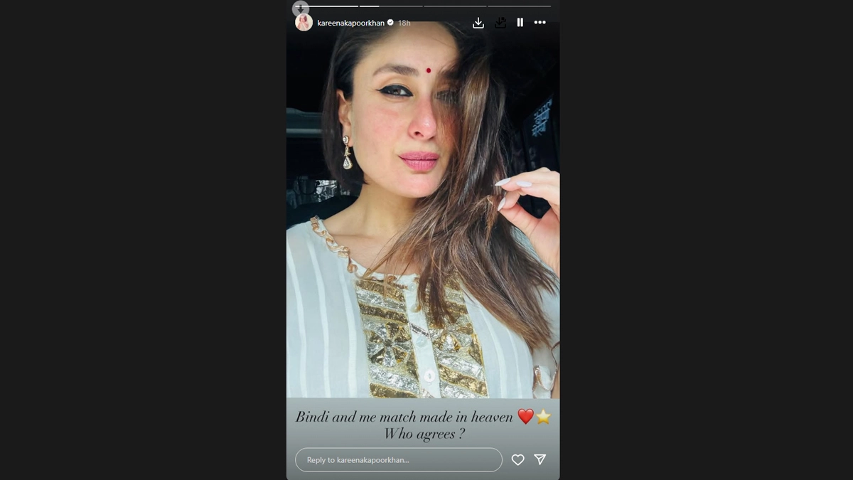 Kareena also shared a solo picture of herself, exuding charm as she was dressed in a white dress, pairing it with kohl eyes, minimal jewellery, and a red bindi.