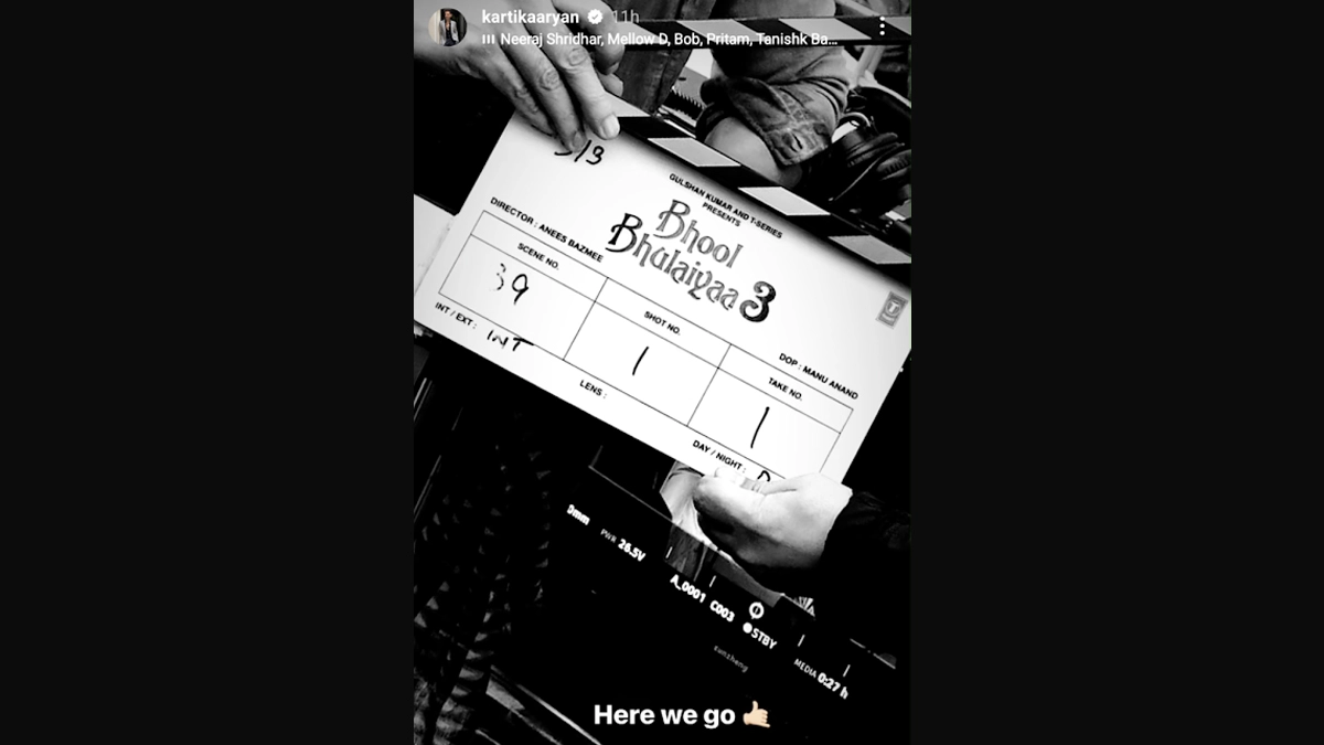 Actor Kartik Aaryan has commenced the shooting for his upcoming horror comedy film Bhool Bhulaiyaa 3. On Saturday night, the actor took to Instagram and shared a glimpse from the first-day shoot of Bhool Bhulaiyaa 3. The Shehzaada actor shared a monochrome snap of the film's clapboard that he captioned, "Here we go." He also added the title track of Bhool Bhulaiyaa 2 in the background.Helmed by Anees Bazmee, the third part of the hit franchise also stars Vidya Balan and Triptii Dimri in the lead roles and is all set to hit the theatres on the occasion of Diwali 2024. Bhool Bhulaiyaa 3 Announced! Kartik Aaryan to Return as Rooh Baba Once Again For Anees Bazmee Directorial; Film to Release on Diwali 2024.
