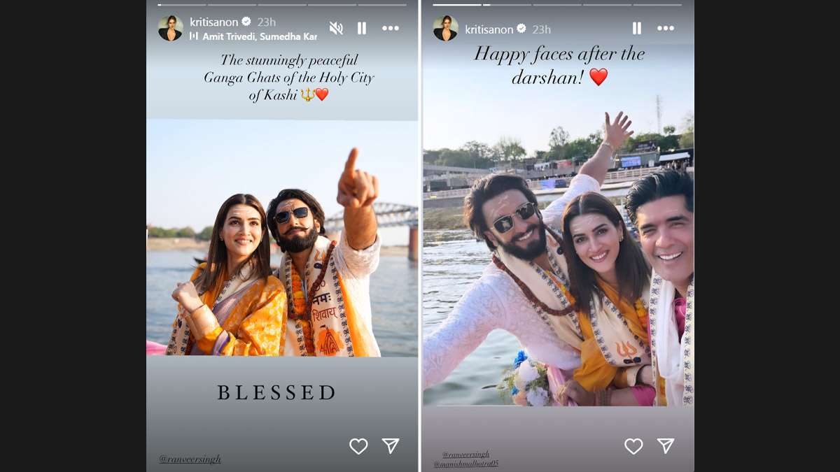 Actors Ranveer Singh and Kriti Sanon recently visited Varanasi to participate in a fashion show for designer Manish Malhotra. Amidst their busy work schedule, the two took time out for a darshan. On Tuesday, Kriti took her Instagram stories to share beautiful pictures from Varanasi's Ganga Ghats. One of the pictures shows her posing happily with Ranveer Singh. In another picture, Kriti can be seen with Ranveer and Manish for a cheerful selfie after their visit. Kriti can be seen dressed in a yellow salwar suit, while Ranveer chose a white kurta. Ranveer Singh, Kriti Sanon, and Manish Malhotra Offer Prayers at Kashi Vishwanath Temple, Varanasi (View Pics).
