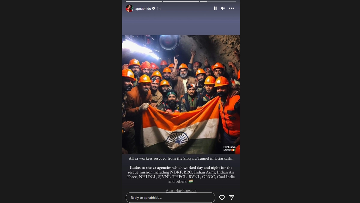 Actor Jackie Shroff applauded the efforts of 22 agencies that have rescued 41 workers trapped in the Silkyara tunnel in Uttarkashi. Jackie took to Instagram Story and shared a picture of rescuers. He wrote, "All 41 workers rescued from the Silkyara Tunnel in Uttarkashi.Kudos to the 22 agencies which worked day and night for the rescue mission including NDRE, BRO, Indian Army, Indian Air Force, NHIDCL, SJVNL, THFCL, RVNL, ONGC, Coal India and others." Uttarakhand Tunnel Rescue Operation Successful: NDRF Personnel Celebrate by Cutting Cake After Rescuing 41 Trapped Workers From Silkyara Tunnel (Watch Video).