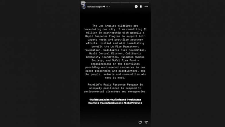Oscar-winning actor Leonardo DiCaprio has announced a donation of USD 1 million to aid the ongoing wildfire relief and recovery efforts in Los Angeles County. The actor made the announcement on social media, expressing his concern over the devastating impact of the recent wildfires in the region. In a message shared via his Instagram stories, DiCaprio wrote, "The Los Angeles wildfires are devastating our city. I am committing USD 1 million in partnership with @rewild's Rapid Response Program to support both urgent needs and post-fire recovery efforts." Los Angeles Wildfire: Warner Bros. Discovery Offers USD 15 Million to Thousands of Employees Affected by Southern California Fire To Help Pay Rent, Rebuild.