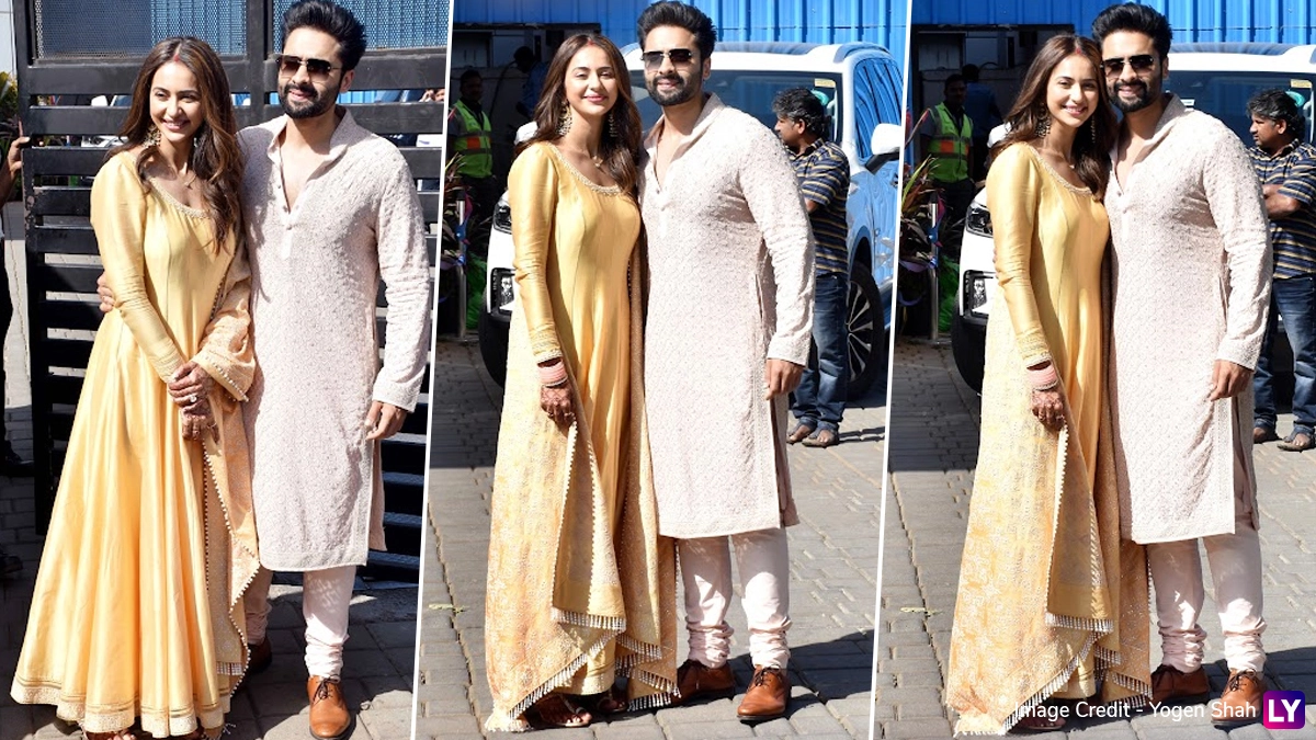 Rakul looked beautiful in a yellow Anarkali set with a golden dupatta. Jackky, on the other hand, opted for cream-coloured kurta pyjamas. The couple were seen distributing hampers to paparazzi and the media as they showered their love on them.