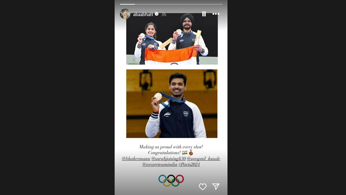 Alia Bhatt joined the Indian film fraternity in lauding and congratulating Swapnil Kusale, Sarabjot Singh, and Manu Bhaker for their victories at the Paris Olympics 2024. Taking to her Instagram story, Alia shared a collage featuring Manu Bhaker, Sarabjot Singh, and Swapnil Kusale. Like every Indian right now, Alia expressed her feelings and wrote, "Making us proud with every shot! Congratulations! @bhakermanu @sarabjotsingh30 @swapnil_kusale @weareteamindia #Paris2024." Paris Olympics 2024 Prize Money: Here's How Much Athletes Will Earn For Winning Medals at Summer Olympic Games in France.