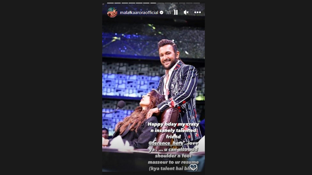 Actor Malaika Arora poured in love and wishes for her friend and choreographer Terence Lewis on his birthday. Taking to Instagram story, Malaika dropped a cute picture of herself with the birthday boy from the dance reality show sets. In the picture, Terence can be giving a massage to Malaika. Sharing the picture, she wrote, "Happy bday my crazy n insanely talented friend. Love ya...u can also add shoulder n foot masseur to ur resume (kya talent hai bhai)." Are Malaika Arora and Arjun Kapoor Ready To Get Married? Model-Actress Spills the Beans on Their Wedding Plans.