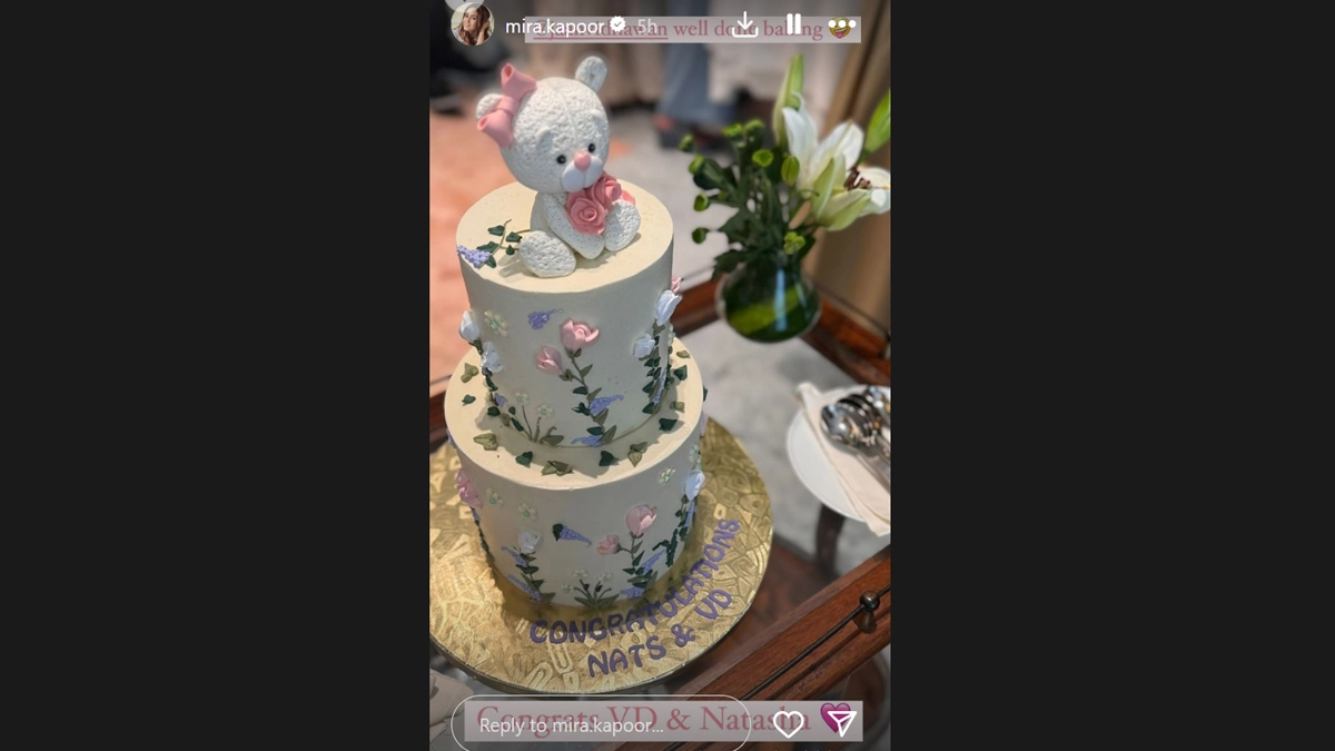 Actor Varun Dhawan and his wife Natasha Dalal hosted a close-knit baby shower on Sunday. Mira Rajput Kapoor, who is actor Shahid Kapoor's wife, attended the baby shower and also shared a cute picture from the special occasion. Taking to her Instagram stories, Varun shared the cake photo. It is a tiered cake with a cute little teddy on top. The caption reads, "Congratulations Nats & VD. Congrats VD & Natasha," followed by a pink heart emoji. On behalf of Natasha and Varun, their team even distributed sweets to the paps stationed outside their residence today. Natasha Dalal Baby Shower Ceremony: Unseen Pics From Varun Dhawan’s Wife’s Special Event Take the Internet by Storm!.