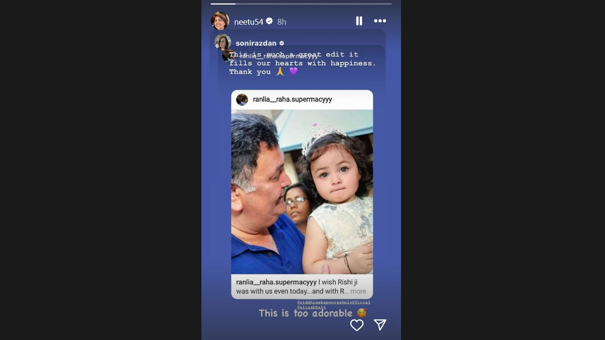 An edited adorable photo featuring late actor Rishi Kapoor with his granddaughter Raha Kapoor has gone viral. The late actor's wife Neetu Kapoor took to Instagram stories and reacted to the adorable picture. She wrote, "I wish Rishi ji was with us even today... and with Raha too." In the edited picture, Rishi can be seen holding Raha in his arms and giving smile to her. Rishi wore a blue T-shirt, while Raha wore a printed white dress and a tiara. Ranbir Kapoor Fears That Daughter Raha May Not Recognise Him Clean Shaven.