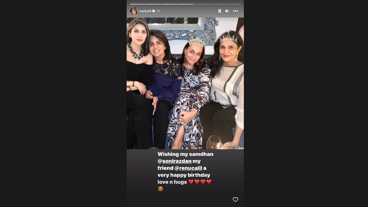 Actor Neetu Kapoor sent a warm birthday wish to Soni Razdan on social media. The Jug Jugg Jeeyo actor took to her Instagram Story and posted a picture where she can be seen with Soni Razdan, Riddhima Kapoor Sahni and a friend Renu Calil. Sharing the picture, she wrote, "Wishing my samdhan @sonirazdan my friend @renucalil a very happy birthday, love and hugs." Alia Bhatt Pens the Sweetest Birthday Note for Her Maa Soni Razdan (View Post).