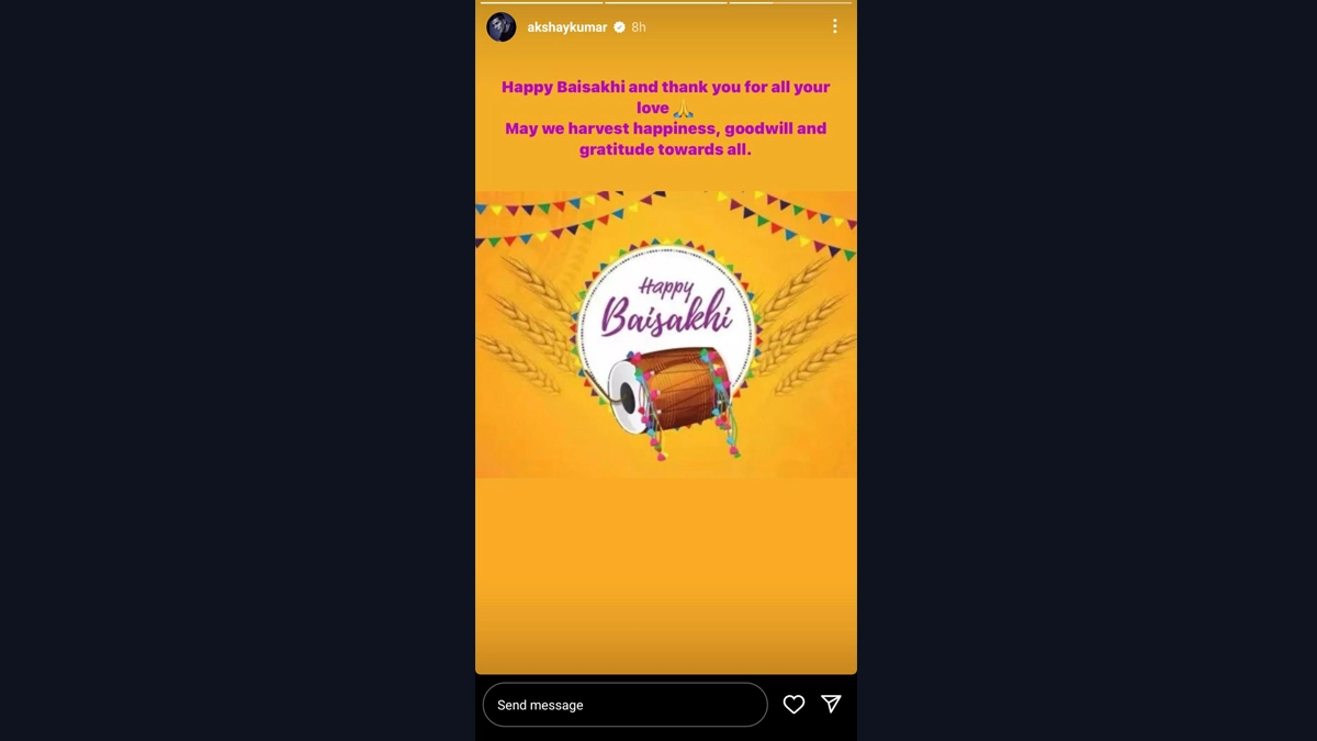 Preity Zinta also shared her greetings for the harvest festival. Ajay Devgan took to Instagram stories to wish his followers. He wrote, "Baisakhi di lakh lakh vadaiyaan." Expressing gratitude for love, Akshay Kumar extended wishes on this joyous occasion. Bade Miyan Chote Miyan actor wrote, "Happy Baisakhi and thank you for all your love. May we harvest happiness, goodwill and gratitude towards all." To celebrate the festival, people visit Gurudwaras, seek blessings, and participate in Nagar Kirtan. Kada prasad is distributed among the devotees.