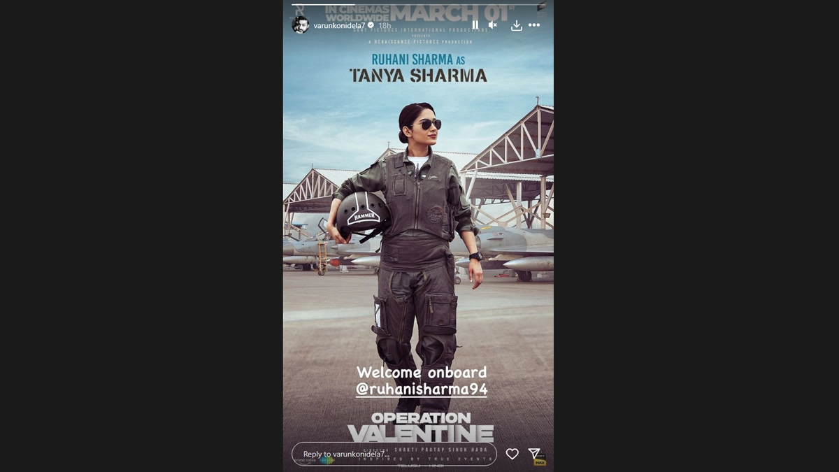 Varun Tej on Monday welcomed actor Ruhani Sharma to a team of the much-awaited patriotic thriller Operation Valentine. Taking to Instagram story, Varun treated fans with the first-look poster and introduced her character's name. In the poster, donning a uniform as a member of the Indian Airforce Department. Sharing the poster, Varun wrote, "Ruhani Sharma as Tanya Sharma. Welcome onboard @ruhanisharma94. Operation Valentine." Operation Valentine Teaser: From Varun Tej–Manushi Chhillar’s Romance to the Fierce Aerial Attacks, Shakti Pratap Singh Hada’s Film Promises an Edge-of-the-Seat Entertainer (Watch Video).