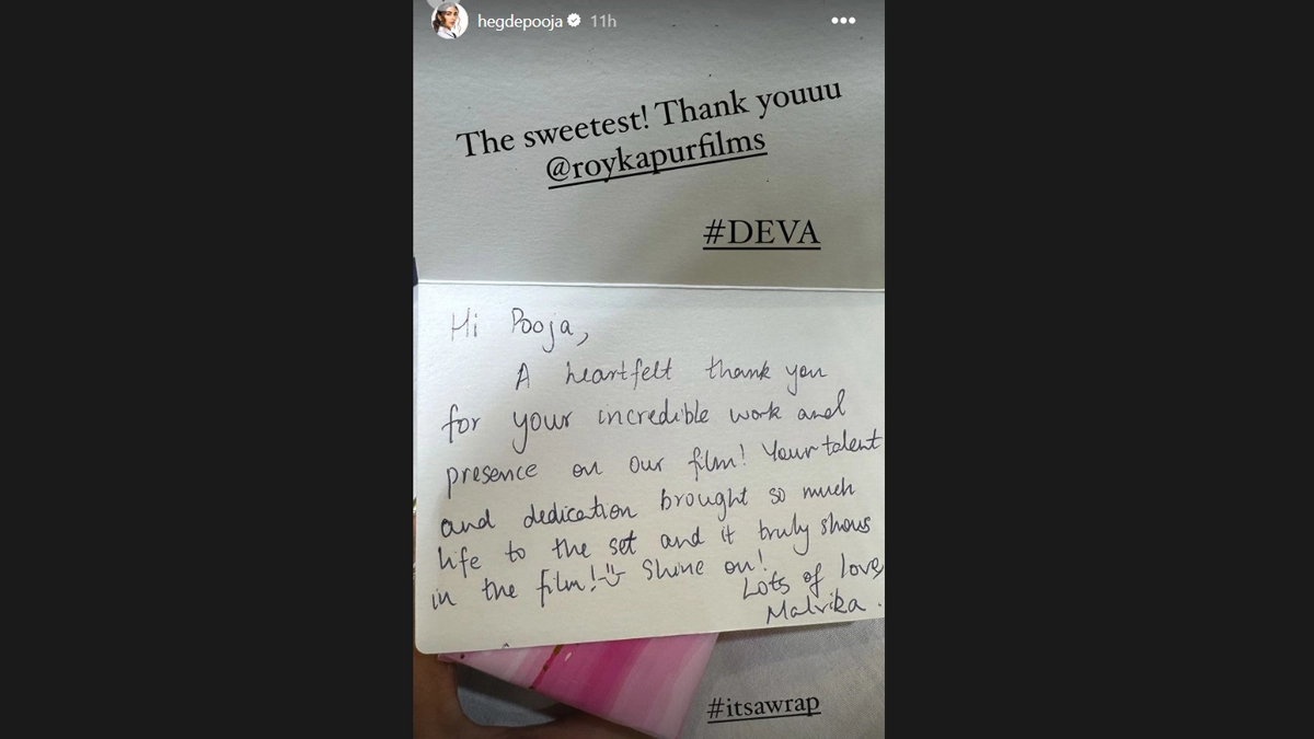Actor Pooja Hegde has wrapped up the shooting of her upcoming film Deva. Pooja took to Instagram Stories on Tuesday and shared a picture of 'Thank you note' which read, "Hi Pooja, A heartfelt thank you for your incredible work and presence on our film! Your talent and dedication brought so much life to the set and it truly shows in the film!" Shine on, Lots of love, Malvika."She captioned the picture and wrote, "The Sweetest. Thank you @roykapurfilms #DEVA #itsawrap" Deva: Shahid Kapoor Looks Solid in New Monochrome BTS Glimpse From His Upcoming Film Directed by Rosshan Andrrews (See Pic).