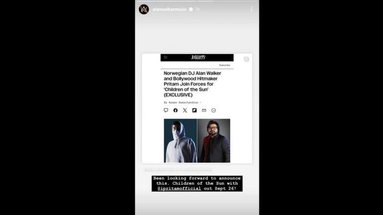 Renowned music composer Pritam Chakraborty has collaborated with Norwegian DJ and musician Alan Walker. The two are all set to come up with the track "Children of the Sun" via Warner Music India. The song, which also features vocals from Vishal Mishra, blends Eastern and Western musical influences, Variety reported. Chandu Champion Song ‘Sarphira’: Kartik Aaryan As Murlikant Petkar Embodies Never Give Up Attitude in This Heart-Pumping Track Crooned by Sreerama Chandra (Watch Video).