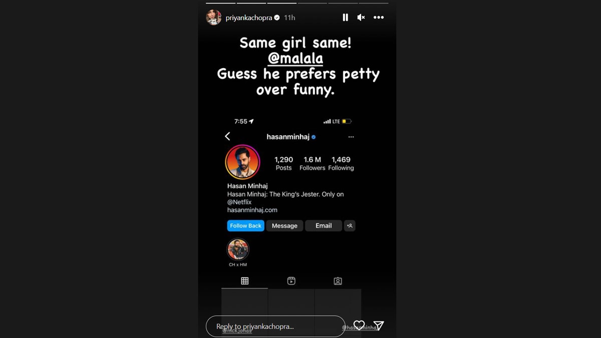 Then Malala wrote a message with the reel ,"thanks to everyone who sent me this video because I no longer follow this man." And, soon after, Priyanka Chopra came in support of Malala and shared a screenshot showing that even she doesn't follow Hasan back on Instagram!