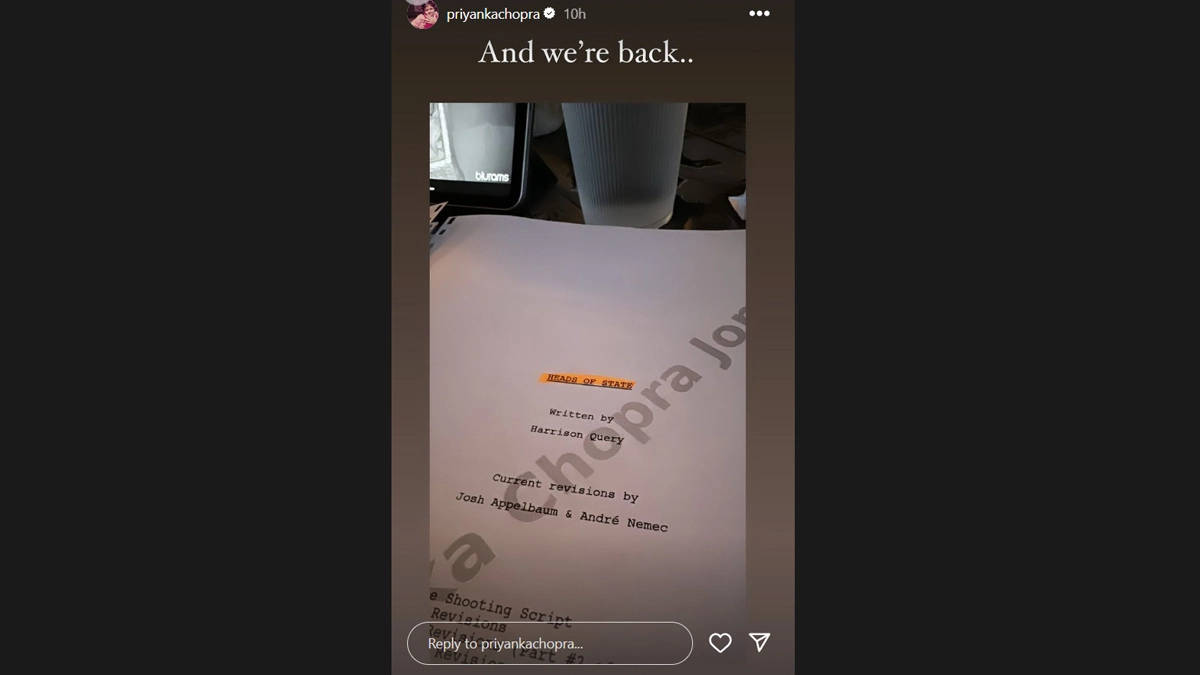 Priyanka Chopra Jonas, who recently enjoyed her vacation with family in India, is back to work as she returns to the sets of her next Hollywood film Heads Of State. Taking to Instagram, Priyanka gave a glimpse of the script. The page had the film's title and mentioned that Harrison Query wrote it. It also has the Priyanka's name watermarked on it. Sharing the photo, she wrote, "And we're back." She will be seen in Heads of State alongside John Cena and Idris Elba. Priyanka on Wednesday announced her new film in collaboration with the production team of Barry Avrich's new feature documentary Born Hungry as a producer. Taking to Instagram, Priyanka treated fans with this exciting news by sharing an article with a note. Tiger: Priyanka Chopra Reveals That the Upcoming Disneynature Film Was Shot Over Eight Years.