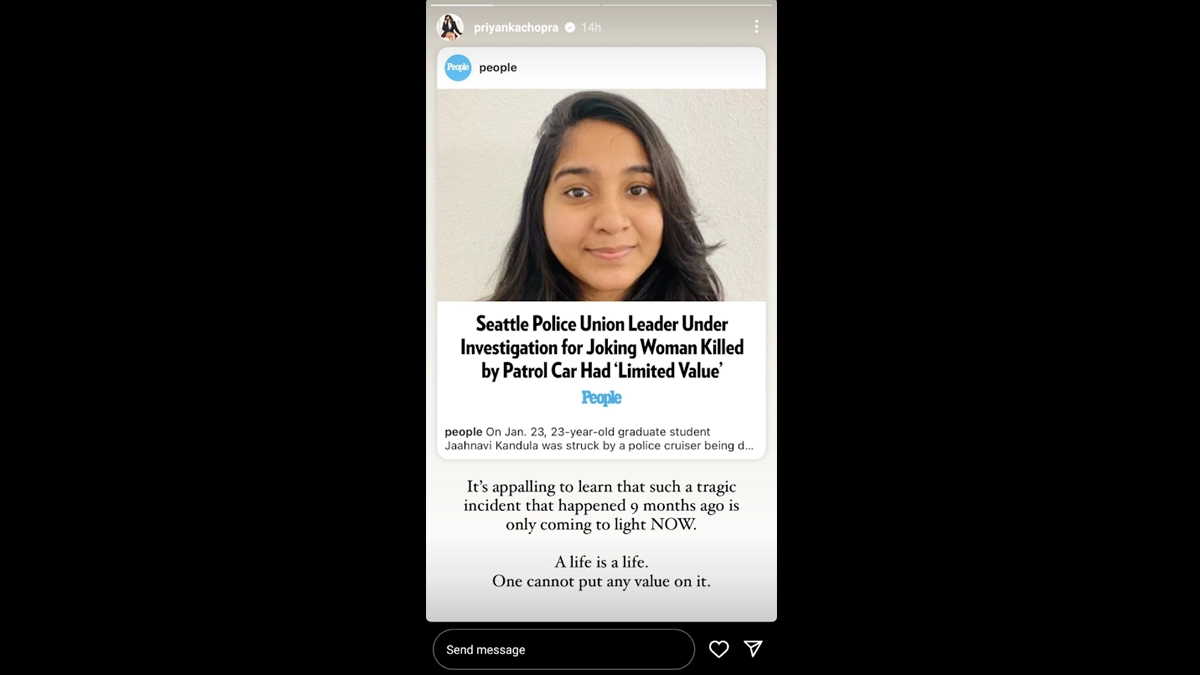In bodycam footage released on Monday by the Seattle Police Department, Officer Daniel Auderer laughed about the deadly crash and dismissed any implication Dave might be at fault or that a criminal investigation was necessary. "It's appalling to learn that such a tragic incident that happened 9 months ago is only coming to light NOW. A life is a life. One cannot put any value to it," Priyanka, who is based out of Los Angeles, wrote on her Instagram Stories Saturday night. Jaahnavi Kandula Accident in US: Indian American Congressman Raja Krishnamoorthi Urges Seattle Police Investigation Into Death of Indian Student With the Seriousness It Demands.