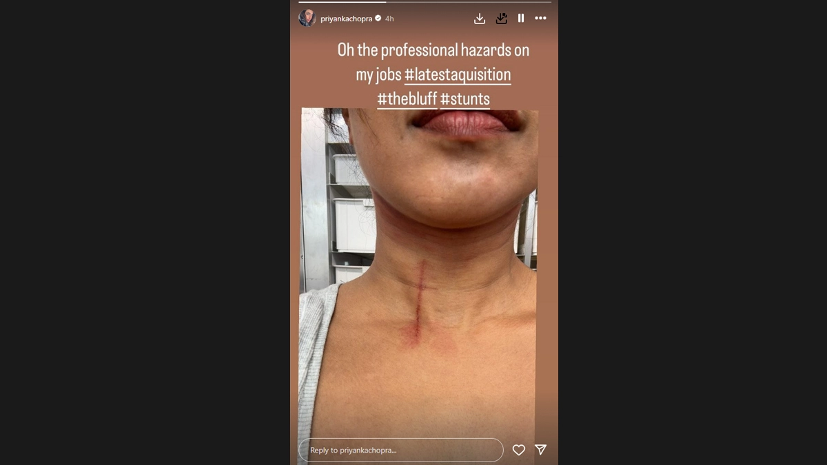 Actor Priyanka Chopra recently shared a glimpse of her recent injury while filming her upcoming movie, The Bluff. Known for her candour on social media, Chopra took to Instagram Stories to update fans on a challenging moment during the production. In a series of updates on Wednesday morning, Chopra revealed a photograph of a bruise just below her throat, incurred during the filming of The Bluff. "Oh the professional hazards on my jobs," Chopra captioned the image, along with hashtags referencing her latest project, The Bluff, and the demanding stunts involved in its production. Priyanka Chopra Congratulates Angelina Jolie on Her Tony Award Win; Actress Writes ‘I’m So Inspired by You Every Day’ (View Pic).