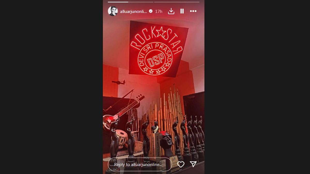 Building more excitement among the fans, actor Allu Arjun shared a photo from a music recording session with Pushpa: The Rule director Sukumar and music director Devi Sri Prasad. Taking to Instagram stories on Thursday, Allu Arjun treated fans with new pictures. The first picture gave a glimpse of Devi Sri Prasad's recording studio. The image captured awards and logo. Allu Arjun also posted an image in which he is posing with Sukumar and DSP in all-black outfits inside the studio. Sharing the photo, he wrote, "The Rule" Rashmika Mandanna, who is celebrating her 28th birthday in the UAE, could not join but re-shared the picture on her Instagram stories. Sharing the photo, she wrote, "Ayeee the big boys creating something iconic" Allu Arjun's birthday will be extra special as Pushpa 2 teaser is scheduled to be out on April 8. Pushpa 2 - The Rule: Allu Arjun to Start Marathon Shooting Schedule From August 6!.