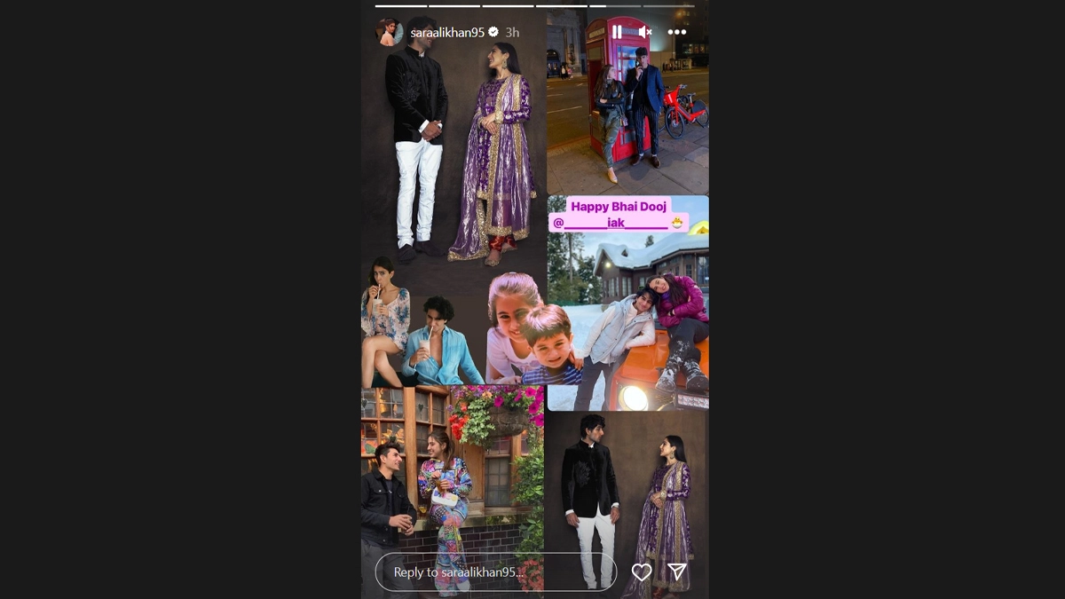 Actor Sara Ali Khan on Wednesday extended Bhai Dooj wishes to brother Ibrahim Ali Khan. Sara shared a collage picture with Ibrahim on her Instagram Story and wrote, "Happy Bhai Dooj @__iak__" Sara and Ibrahim are among the most popular siblings in Bollywood and often share pictures on social media.Sara Ali Khan Recently, Sara shared a picture with her brother in which they both are seen in traditional looks. She posted two photographs, one solo of herself and another with her brother. Ibrahim opted for a maroon-shaded silk kurta with a matching Nehru jacket and white pyjamas. He looked dapper in his outfit with a beard and an unkempt hairstyle. Sara, on the other hand, looked stunning in a red-hued suit with gold zari borders. She paired it with a dual-toned dupatta in red and purple. Sara Ali Khan Shares 'Sunday Thoughts' via Her Book; No Battle of Life Lies Outside.